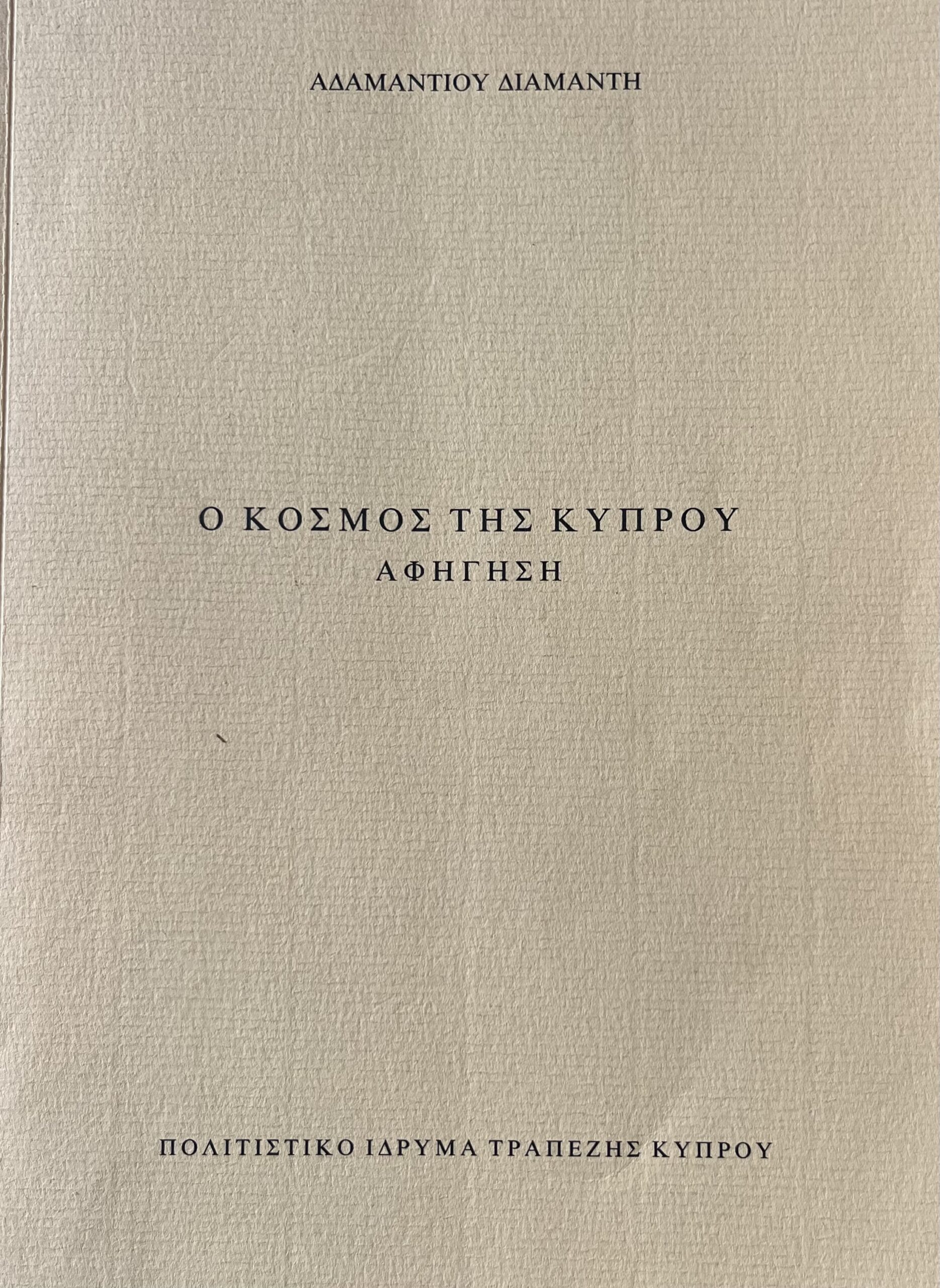 “Η παρούσα επανέκδοση της Αφήγησης του Αδαμάντιου Διαμαντή “Ο Κόσμος της Κύπρου”, αποτελεί, έκφραση της βαθύτατης εκτίμησής μας στο μεγάλο Κύπριο ζωγράφο και, παράλληλα, γενέθλιο δώρο για τα ενενήντα δύο του δημιουργικά έτη τα οποία συμπληρώνει στις 23 Ιανουαρίου του 1992.[…] Η Αφήγηση, καταγράφει με κάθε λεπτομέρεια την πορεία της σύλληψης και της δημιουργίας του μνημειώδους έργου “Ο Κόσμος της Κύπρου”.